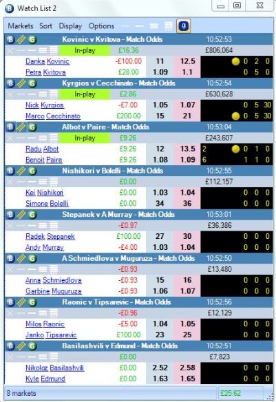 If you have the games loaded in a watch list as soon as you hear your alert you can quickly identify which match it is from the live score feed and launch it with a single click and begin your manual trading (see top image).