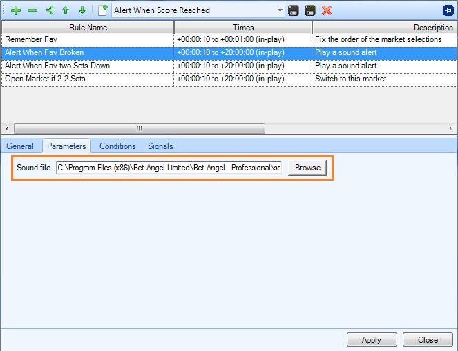 Once you have dowloaded the file above you need to add the sound files to be used from your own PC, do this by clicking on the ‘Edit Rules File’ select the ‘Alert when fav is Broken’ rule type and go to the parameters tab (as shown in image below) then browse for a sound file to use for that alert from your local PC, once saved do this again for the ‘Alert When Fav two sets down’ rule type.